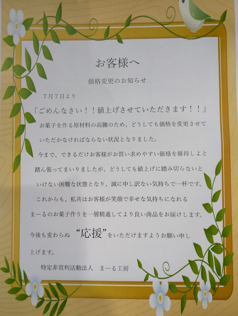2025年6月10日 / 最終更新日時 : 2026年1月21日 ma-rukoubou まーる菓子工房 ごめんなさい・・・値上げのお知らせです。 物価高騰の影響を受けつつも、お値段そのままで頑張ってきましたが・・・ どうか変わらず、まーる工房のお菓子を手にして下さると嬉しいです☆ \ 最新情報をチェック /